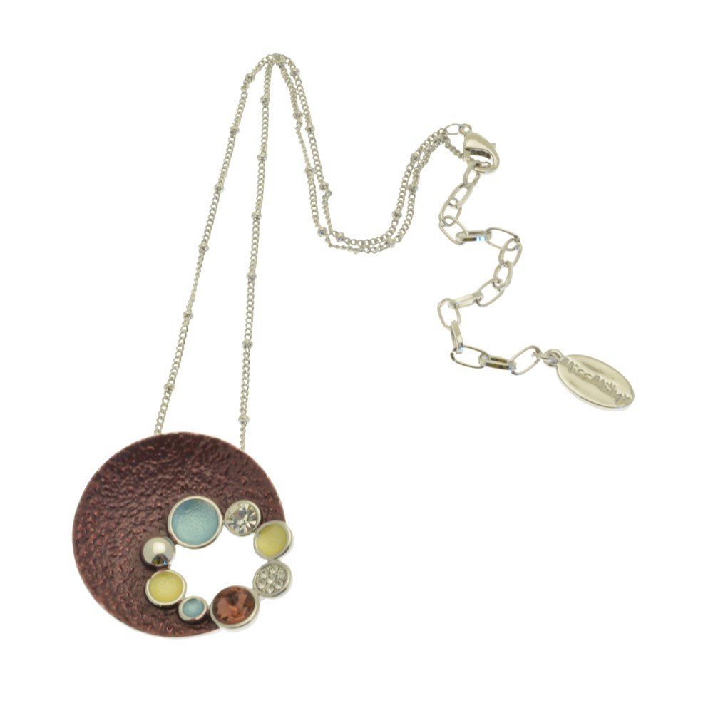 A seasonal mix of on-trend dark red, sky blue and yellow is embellished with sparkling crystals. The pendant measures 3.5cm in diameter and hangs from a knotted style chain of 41cm with an 8cm extender.