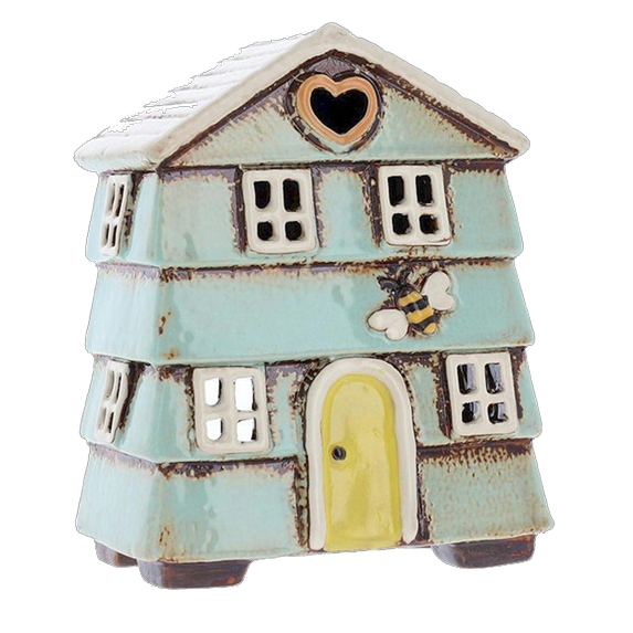 A delightful ceramic cream beehive house tea light holder featuring a brown front door, a heart top window and bee decoration. This tealight will create a magical warm glowing ambience and when not in use as a decoration for any room in the house. Size is 12cm wide x 7.5cm deep x 15.5cm high approximately and has an opening at the back to place tea lights. Crafted and hand finished by artisans for a truly unique gift. Supplied in a box so is easy to wrap.